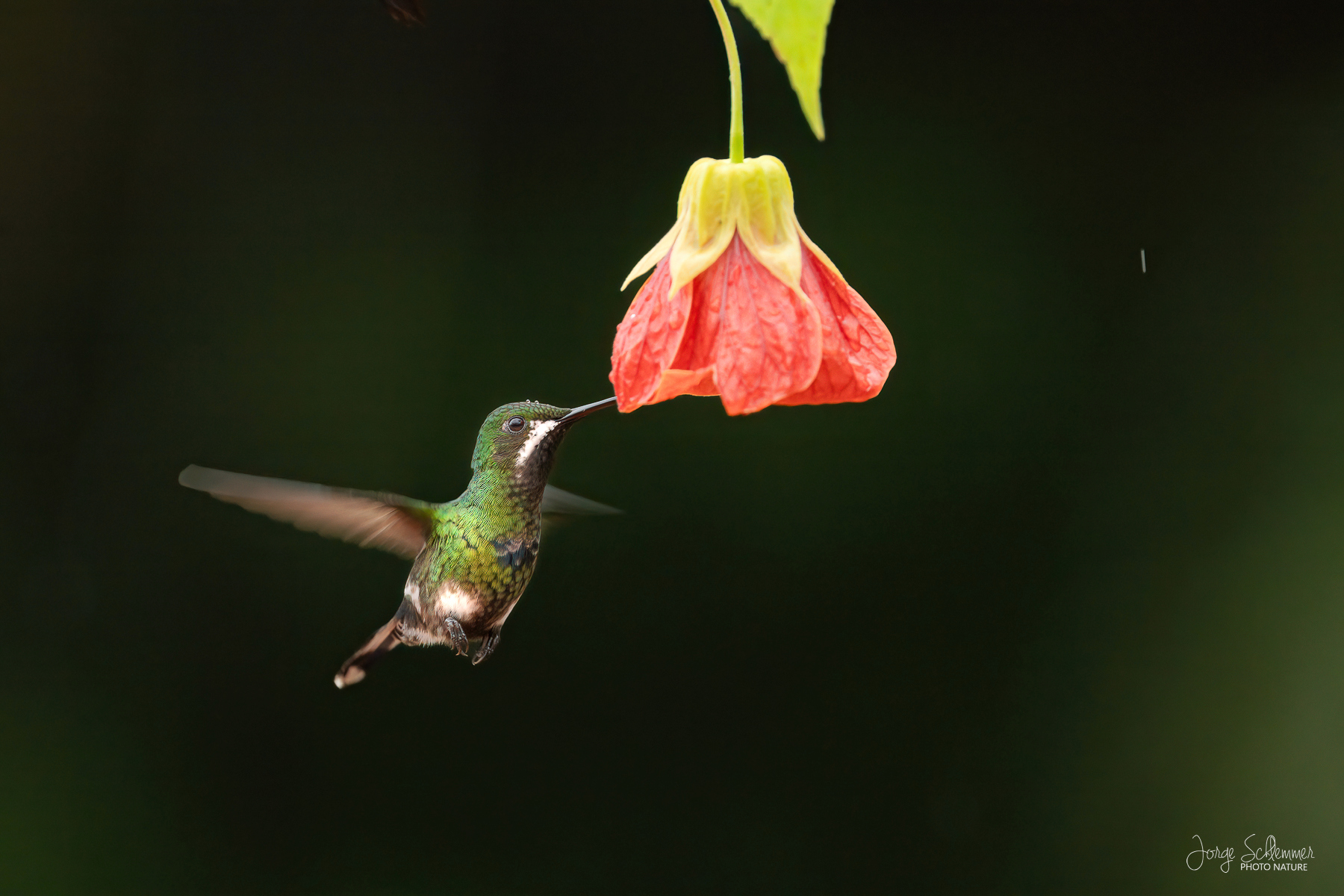 ¡Preciosa! Se luce libando la flor roja con el fondo oscuro.