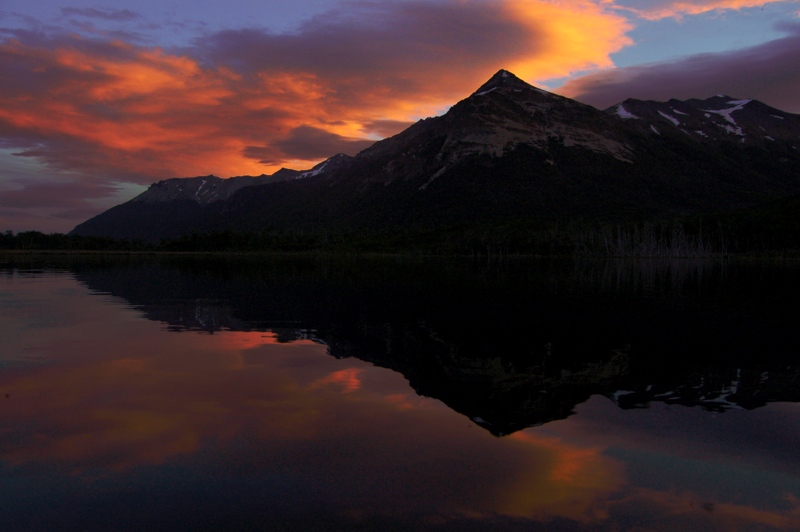 Me gustan los colores de las nubers, las siluetas de la motaña y el reflejo en el agua. Saludos, José