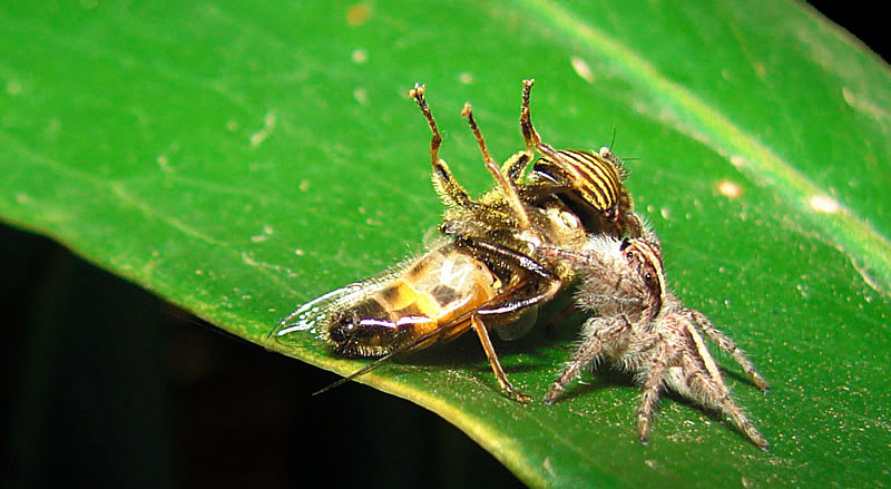 qué buena imagen! increible como la arañita puede con un bicho que la duplica en tamañano (al margen, es un sírfido, no una abeja). felicitaciones :aplausos: