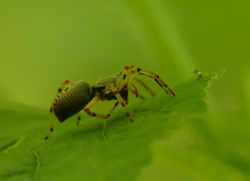 Bueno ni bien llegada a Predelta la mañana del miércoles me interné en la selva en galaría a buscar toma, después de unas lindas moscas, se presentó esta pequeñísima araña, cuyos colores advertí a través del rayno, como no quría usar flash probé con tomas con f más cerrado , debe ser una equivocación, pero igual me gustó como quedó, no por la araña en si, ya que no se quedó un segundo quieta, recorrió la hoha de arriba abajo , de un lado a otro, y yo con una mano daba vuelta la hoja y con la otra intentaba el foco, la cabeza no me la mostró nunca, pero ese desenfoque y verde del fondo me gustó, será que tengo un mambo con los fondos? je je, bueno ahí esta, uds. dirán si está más o menos potable, con toda sinceridad, aquí estoy para aprender. Si alguien sabe que tipo de araña es lo agradezco y la vuelvo a editar como corresponde