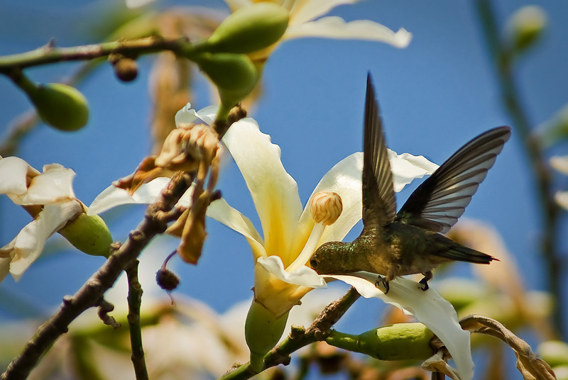 Hola Edwin. Un ave en vuelo siempre depierta mi admiración y una foto de un picaflor (tan difícil por cierto), aún más. Está muy bien captado y al apoyarse en la flor despierta mucha ternura. El árbol es Chorisia insignis (Yuchán o Palo Borracho blanco). Un abrazo
