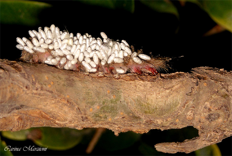 Buena foto Carina, muy interesante la escena. En realidad no son parásitos, sino unas avispitas parasitoides que se alimentan de la oruga hasta matarla (los parásitos usualmente no provocan la muerte de sus hospedadores).