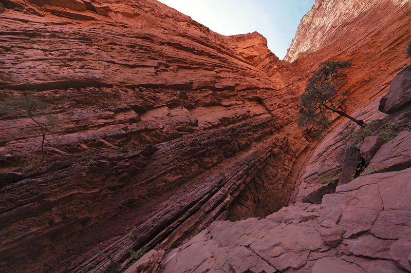 Como comentario final, el árbol de la derecha tiene esa deformación, crece en forma lateral. Si se fijan la última entrada a la "garganta" estan las lajas abiertas para poder acceder en esa diagonal.