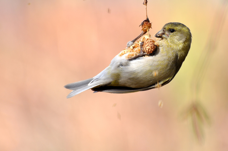 Me encantó la foto, porque muestra comportamiento, una pose del ave que aún siéndola propia, no se la ve a menudo. Además está muy bueno el detalle de las semillas cayéndose, la luz a 45 grados que le aporta volúmen y el fondo con tonos pasteles que le quedan muy bien.