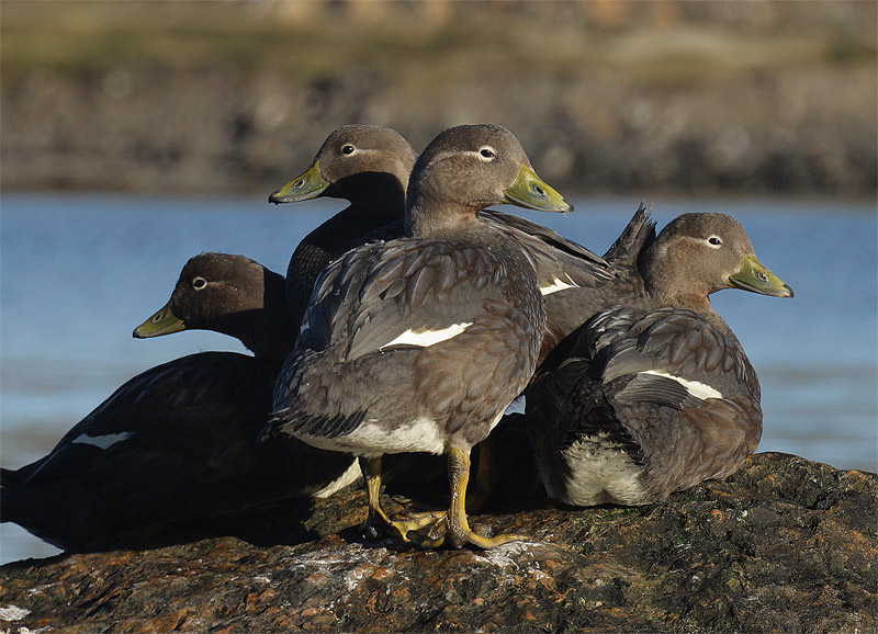 Así que les dejo esta foto, no es la que más me convence pero me gusta la posicion de los patos sobre la roca. La foto fue sacada en la costa del Canal Beagle. Son patos vapor voladores, o quetros voladores, a estos tambien es comun de observarlos en espejos de agua dulce asi como tambien arroyos y ríos. Espero criticas, de esa manera se aprende más rapido.