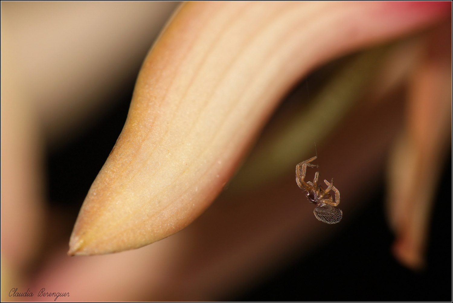 El pétalo resulta demasiado grande para la arañita, que resulta salvada por un foco magnífico.