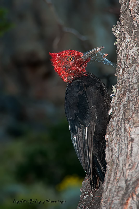 Que bueno tener tan cerca semejante carpintero, la foto quedó buenísima y al tela de araña entre el pico y el árbol suma mucho.
