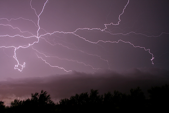 el cielo con tonos violáceos,las siluetas negras y esas rayas de relampago hacen un conjunto excelente.. me encanto la foto!! es buenisima..