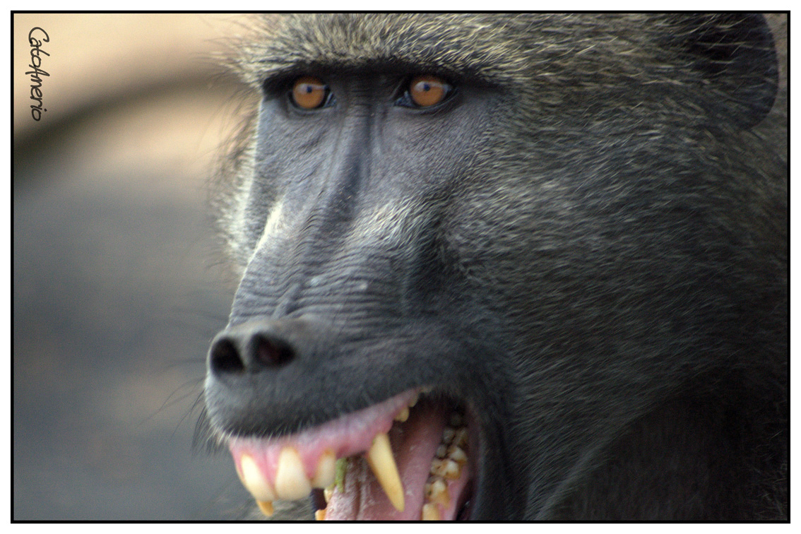 Toma realizada a un babuino macho al cual no le gusto mucho el acercamiento y respondio con muy mal humor. Lugar SudAfrica. Blanco como un papel despues del clik. de la maquina.