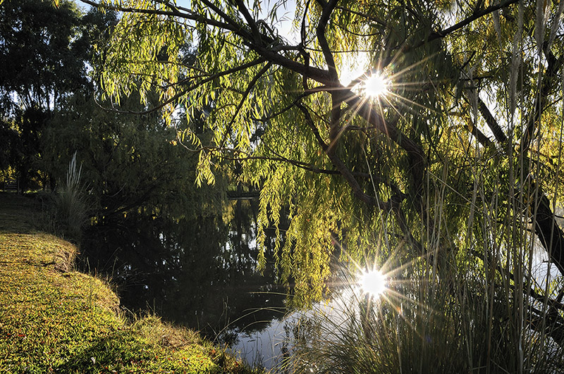Volviendo a mis inicios, en esta ocasión quiero mostrarles este contraluz que pude obtener una mañana muy fría en el sur de Mendoza a la orilla de una laguna. Aproveché que el sol se filtraba entre la copa del árbol de manera casi puntual y busqué con un diafragma bien cerrado ese efecto estrella que es tan llamativo. Como plus, el reflejo en la laguna, con el mismo efecto me hace acordar a la carta 2 de oro...