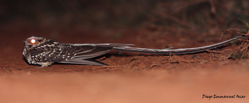 Es un Atajacaminos Coludo (Macropsalis forcipata) pariente del Atajacaminos Tijera que es mas popular y facil de observar, las timoneras externas de este bichito miden alrededor de 60 Cm y verlo volar mientras flamea semejante cola en la noche misionera es un espectaculo que me toco vivir hace poquito junto a dos amigos (Jorge LG y Andres)