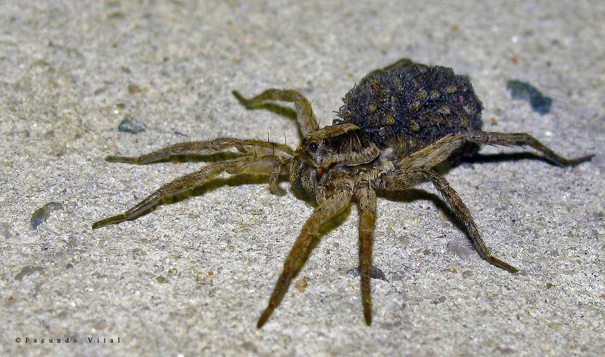 Buenísima la foto, Facundo! muy buena definición, espectaculares esos ojos y las "hijitas" . No me arriesgaría a una identificación exacta pero por la disposición de los ojos tiene toda la pinta de ser de la familia de los licósidos -lycosidae, en "científico"- de la que es parte la araña lobo ("Lycos" = "lobo" en griego).