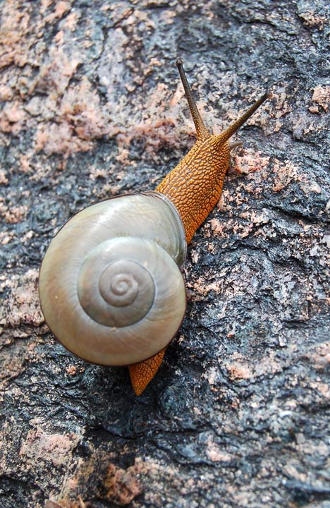Que curioso el color de este caracol..nunca había visto más que los habitulamnete conocidos... La roca sobre la que se mueve le dá un toque muy bueno a la foto....