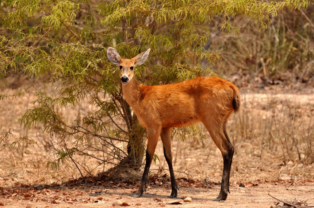 Ya volviendo del Pantanal , saliendo por la Transpantaneira , nos encontramos a esta joven ciervo de los pantanos.Al detenernos me parecio increible poder acercarme a ella hasta cerca de un metro y medio, primero no atine a fotografiarla, porque era algo fuera de lo comun.Esto fue en horas de mediodia y la temperatura de 44 ºC.