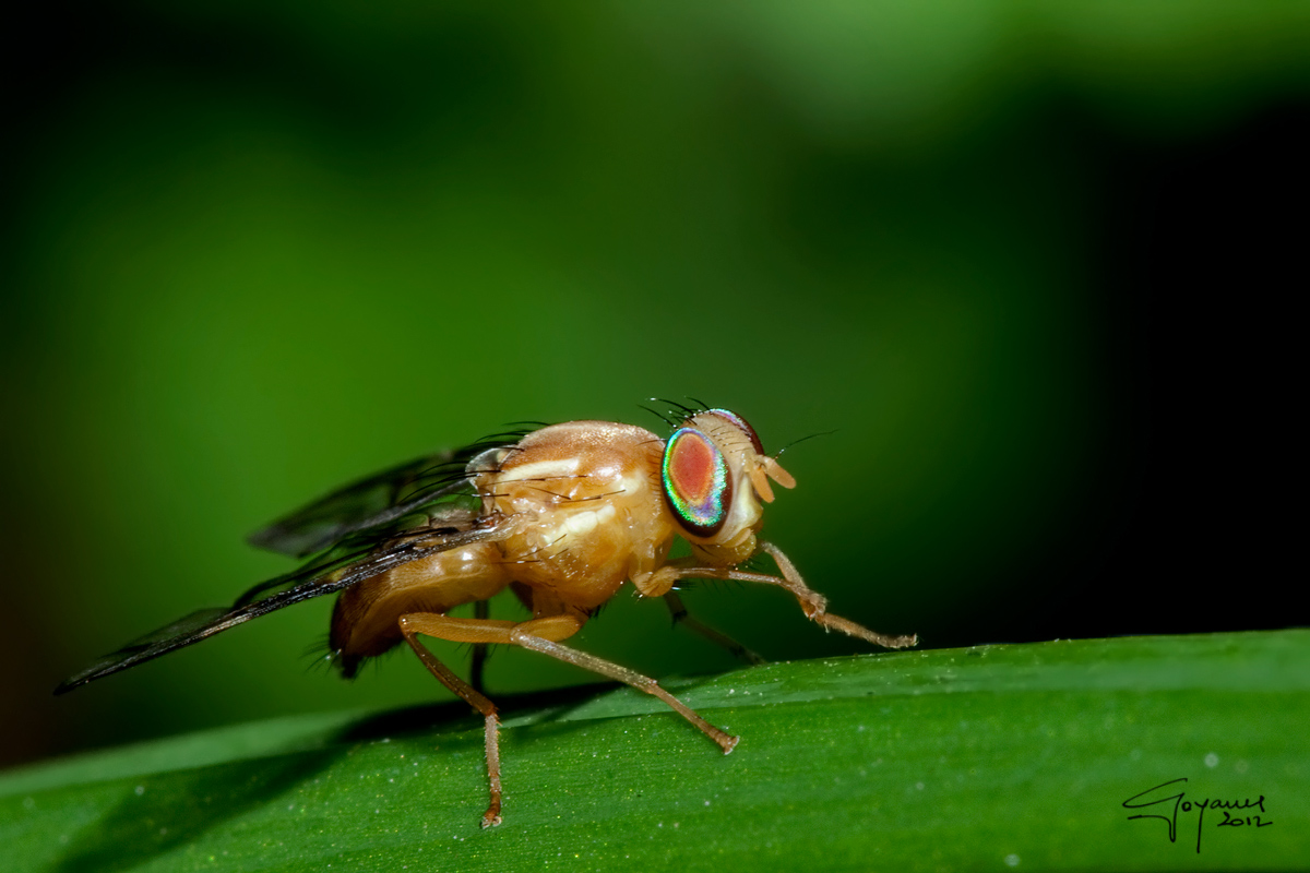 interesantes datos maestro,yo solo conocia a las drosophilas melanogaster,esos ojos impresionates,la veo de muy buen foco,un halo raro en lo verde,y para mi un pelin pasado de luz,felicidades, un abrazo
