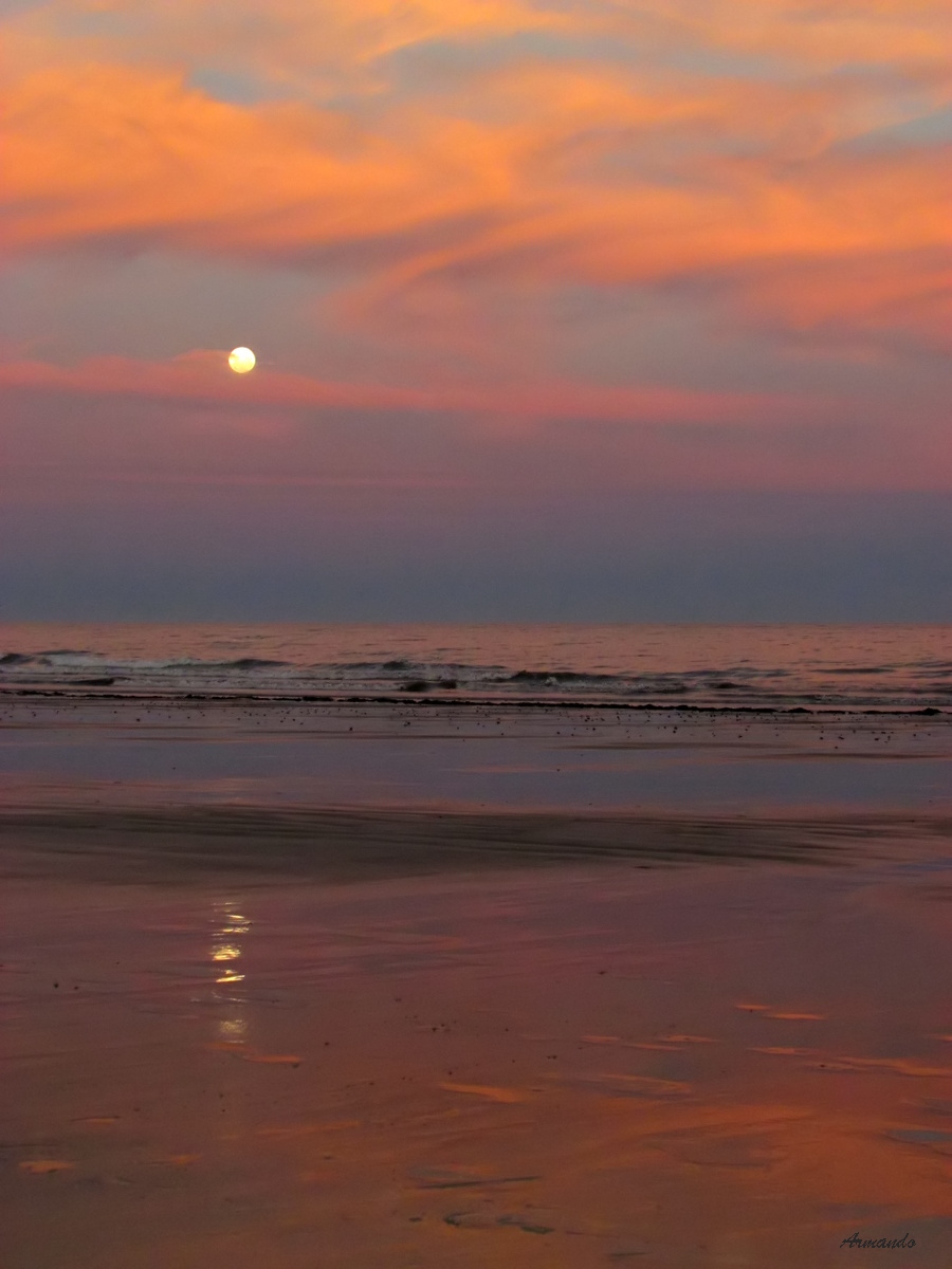 dada la simetría de colores y luces veo muy acertado el horizonte en el medio, haciendo de eje entre el cielo y el reflejo en la playa. Me gustó mucho la composición, la luna entre las nubes y sus reflejos. Muy buenos colores. Una foto muy acertada.