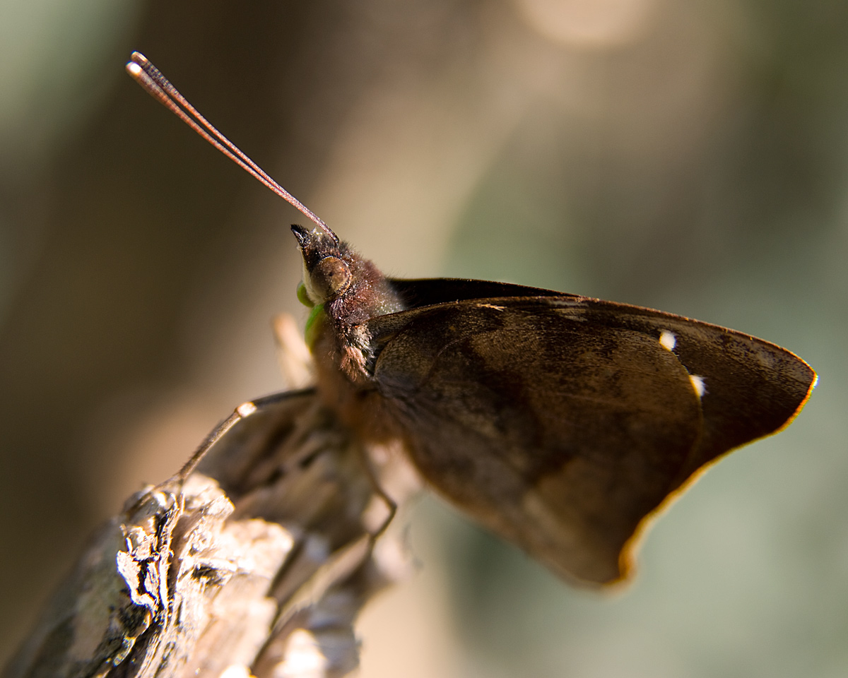 me gustan tus composiciones, veo dos diagonales que forman una T, la mariposa y el posadero, Muy cuidados esos detalles. Buen foco en el ojo, Marcelo tiene razón en subir el f, y entiendo tu respuesta.