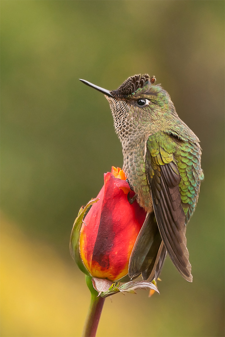D300 Nikon 500 mm 1/250 f 5.6 trípode no flash. En el otoño la falta de flores hace que estos colibríes se "aferren" a aquellas pocas que aun persisten, defendiédolas de sus congéneres. Este bichín se apropió de esta rosa que cuidaba todo el día. Falda del Cerro a unos 850 mts de altura.