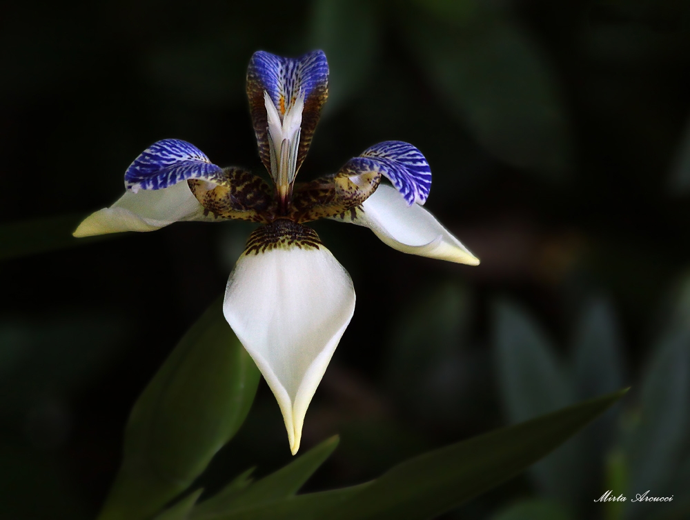 Es una planta rizomatosa erguida crece de 20 a 50cm de altura, hojas en forma de espada de 20 a 40cm. de largo, agudas, de color verde oscuro. Flores dispuestas en fascículos, con los pétalos exteriores planos y blancos, con centro veteado en marrón y los interiores azules, con manchas marrones