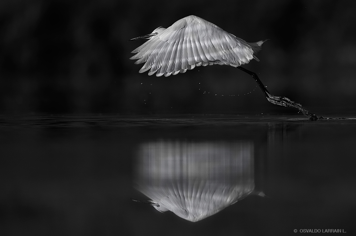 Hola Osvaldo!! Que bueno que te des una vuelta por aquí. Hermosa foto, de un gran impacto ese B y N, muy buen clima. La pose de vuelo y el reflejo quedaron excelentes.