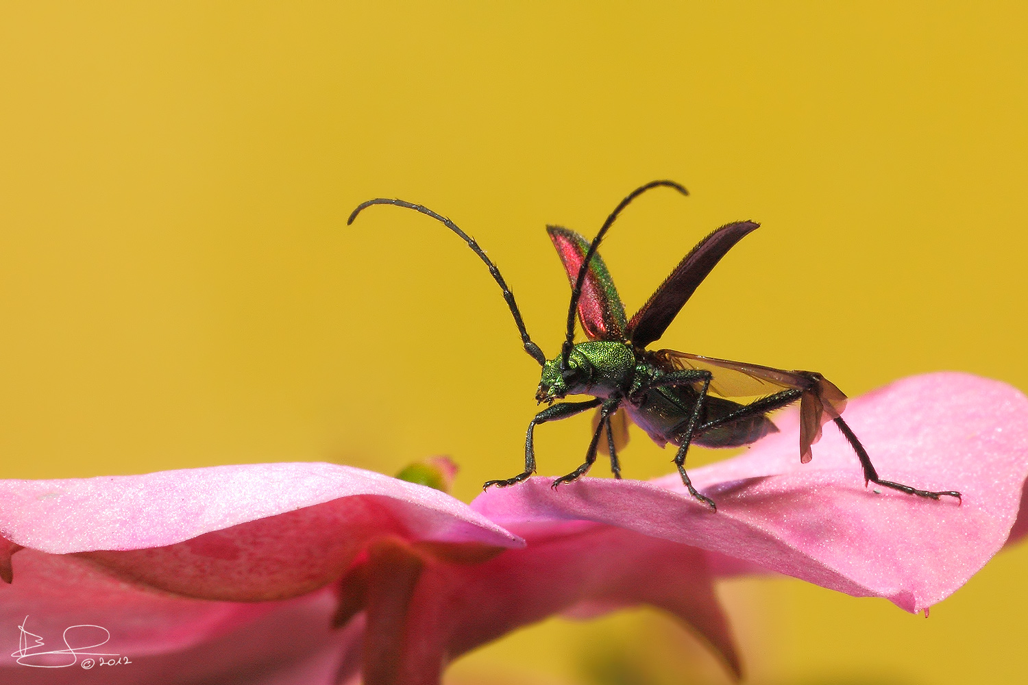 La compo quedò de 10. Los detalles del bicho y la textura del pètalo en el que està apoyado tambièn. El fondo no molesta para nada, aunque està un poco plano. Saludos!!!