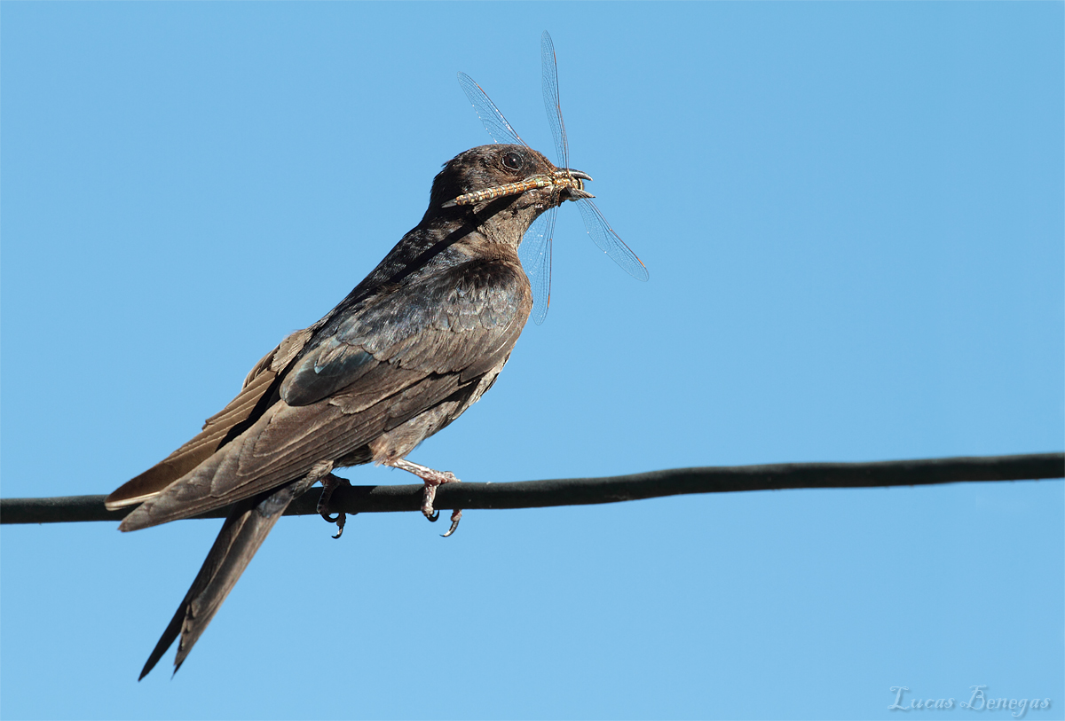 Hola a todos, muchas gracias por los comentarios y felicitaciones de la foto anterior, ésta la saqué un día antes q nazca mi bebé, caminando por la orilla del lago vi un ave oscura q revoloteaba y llevaba comida al nido, pensé de lejos q era un tordo, me acerqué despacio a donde estaba el nido y pude sacarle en una escala que hacía sobre un cable para no delatar la posición de sus pichones. Por cierto, estaban en un hueco en una pared así q imposible verlos. Luego de fotearlo, me moví a unos mtrs y continuó con su labor de alimentar a sus crías. Fue un placer verlo cazar libélulas en el aire con tanta facilidad, y por lo menos vi q trajo de 3 colores diferentes, se ve que estuvo leyendo algo de nutrición, donde dice q hay que comer frutas y verduras de todos los colores jajaja.