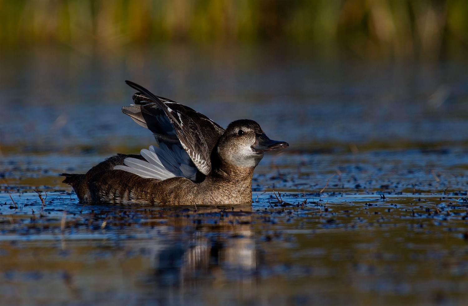 La laguna tiene poca agua, unos 40 cms de profundidad, asi que me desplacé arrodillado dentro del hide. Primero tuve que cruzarla unos 70 metros para poner el sol a mi espalda y después , siempre de rodillas, habré ido hasta unos 150 metros donde estaba la bandada. La aproximación final súper lenta porque en cuanto me movía demasiado los patos se alertaban, elevaban sus cabezas y se sacudían sacándose la modorra como para alistarse para rajar.