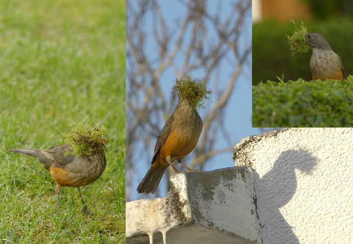 Esta especie contruye su nido con musgo y barro. También fotografié la colecta de barro y el nido q contruyó en una palmera de un jardín a dos metros de altura y a dos metros de un puerta de casa.
