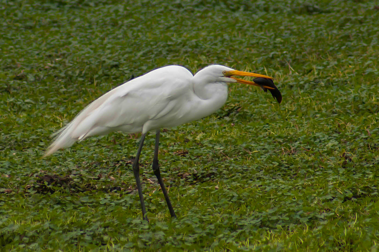 Las morenas que conozco son de mar y terriblemente grandes, seguramente si no se decidió a comerla en el acto debe tener cria en el nido y la lleva para alimentarlos, aunque parece un poco temprano para eso, felicitaciones