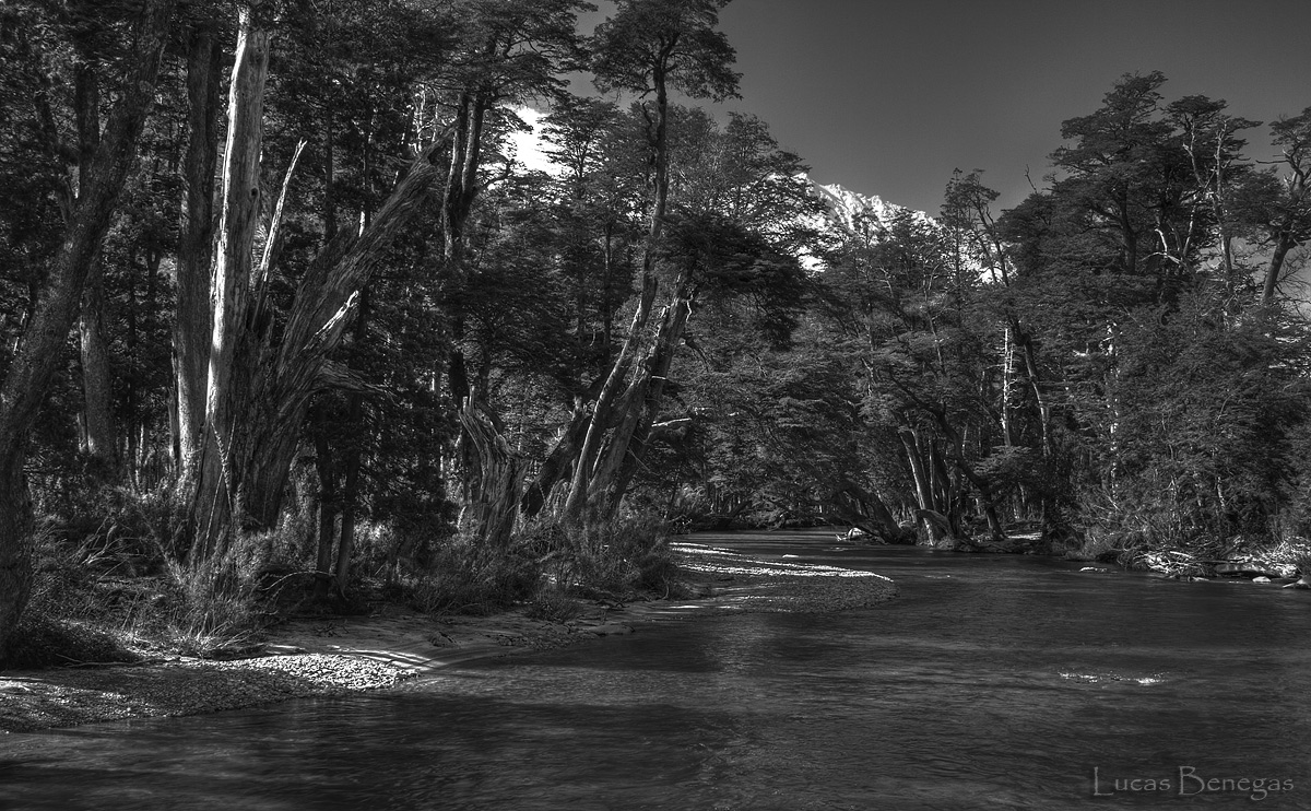 Que belleza de río y lugar Lucas, muy buena foto y el B/N le queda muy bien. Quizás un pelito más luminosa y cuidar algunos halos luminosos cerca de las copas de los árboles. Saludos.
