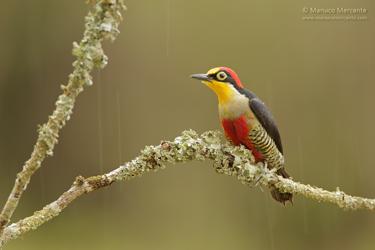 Excelente Manuco!!! Cuanta calidad, me gusta mucho el clima que generan los tonos del fondo y como contrastan con los hermosos colores del carpintero, la lluvia un plus que la hace aún más bella. Felicitaciones!