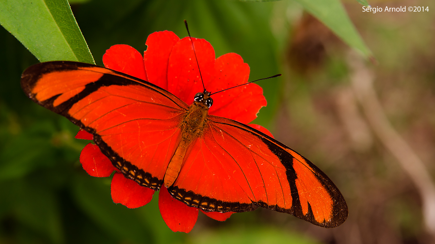 Segunda toma con mariposas, de una Julia (Dryas iulia alcionae), hecha en las misma condiciones y lugar que la Bataraza. Preferí usar encuadre alargado (16:9) para resaltar lo alargada de las alas; también roté 10° el lienzo para mejorar la composición.