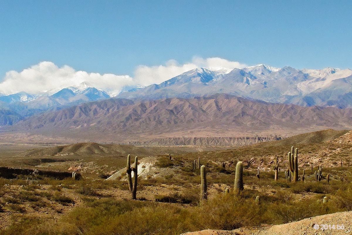 Los cardones custodian orgullosos la belleza de los valles y un manto de bruma muy tenue cubre el macizo desde la base hasta las cumbres opacando el cielo.