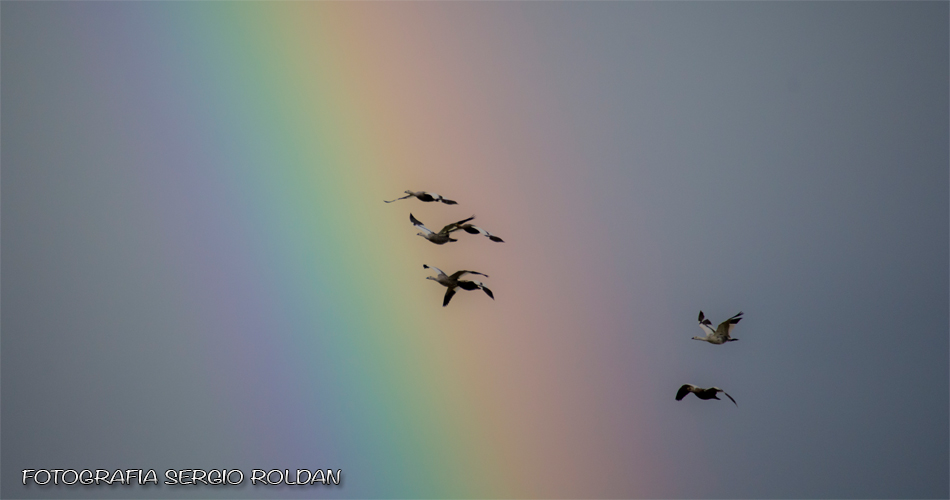 Que buen momento, con el arco iris de fondo, no veo los datos de la fotografía, me pregunto si no daba para acercar mas a las aves que están en el medio, aunque tengas que dejar afuera dos ejemplares, y sin que deje de notarse ese hermoso fondo de distintos colores.