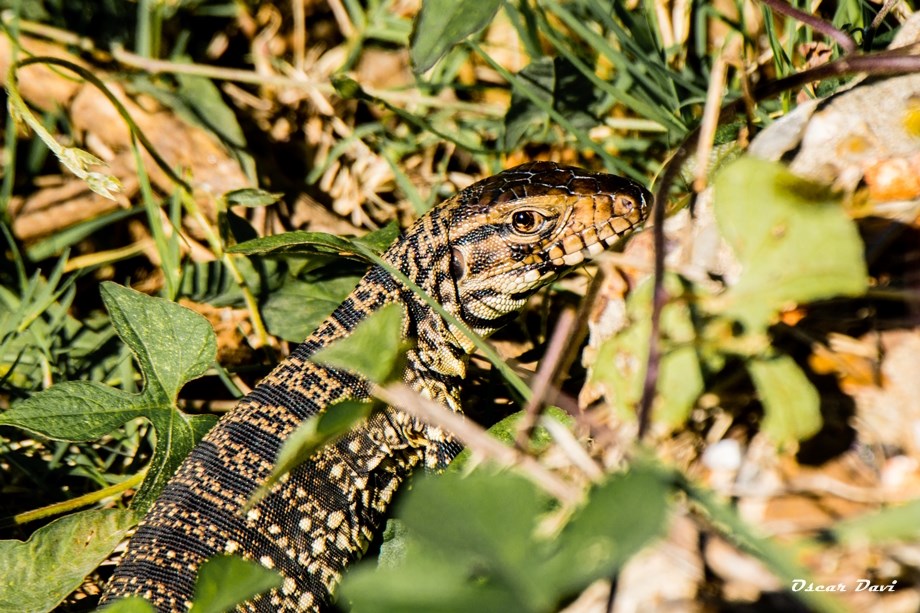 El Lagarto Overo (Tupinambis teguixin) también llamado Iguana Overa o Teyú Guazú en guaraní, es el lagarto de mayor tamaño en nuestro país y uno de los mas corpulentos en todo el mundo. Puede medir cuando adulto 1,30 mts y excepcionalmente alcanzar 1,50 mts, de los cuales la mitad corresponde a la cola. En Argentina habita en la región pampeana, mesopotamia y el chaco oriental. Prefiere ambientes húmedos y en la proximidad de ríos o arroyos. Cava su propia cueva con las garras de las patas traseras, en ella se refugia e hiberna durante el otoño e invierno. Su dieta varía según la edad y tamaño, es decir cuando pequeño come insectos e invertebrados y de adulto frutas, huevos de aves y reptiles, ratones etc. Es muy cazado por su cuero y en algunos lugares se aprovecha su carne. En aquellos lugares donde no es cazado ni molestado se vuelven muy mansos y alcanzan los mayores tamaños. En el vídeo se ve un macho enorme que filmamos mientras se alimentaba de frutas dejadas por acampantes en el Parque Nacional El Palmar, provincia de Entre Ríos, en febrero de 2008. En Costanera Sur es muy fácil de observar en primavera y verano