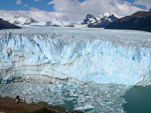 El glaciar Perito Moreno que se encuentra en el Lago Argentino, provincia de Santa Cruz, como podrán apreciar en la foto, es una “lengua” de hielo que se desliza desde las cumbres del cerro Casimiro de 2.115 metros (a la izquierda) y del cerro Pietrobelli de 2.950 metros (a la derecha) , tardando aproximadamente 10.000 años en llegar el hielo desde donde “nace” hasta la pared que se ve en la foto.- Es allí donde “tapa” el vínculo entre uno de los brazos del lago (brazo Rico) y el resto, empezando allí a aumentar éste último su nivel lo que lleva a que, cuando la pared del glaciar no resiste mas el peso de la masa de agua, se rompe produciendo el espectáculo que tanto se espera, nivelando ambas partes del lago para comenzar nuevamente con el desarrollo del ciclo, que suele ser de unos 4 años aunque se ha extendido a 10 desde que se llevan registros.- El frente del glaciar tiene 5 kilómetros de ancho por 200 metros de alto y está en constante movimiento de avance, escuchándose los ruidos del hielo resquebrajarse como si fueran truenos.- Las líneas oscuras casi negras que se ven, son los restos de erupciones volcánicas que depositaron cenizas sobre el glaciar y luego se fue acumulando hielo sobre ellas.-