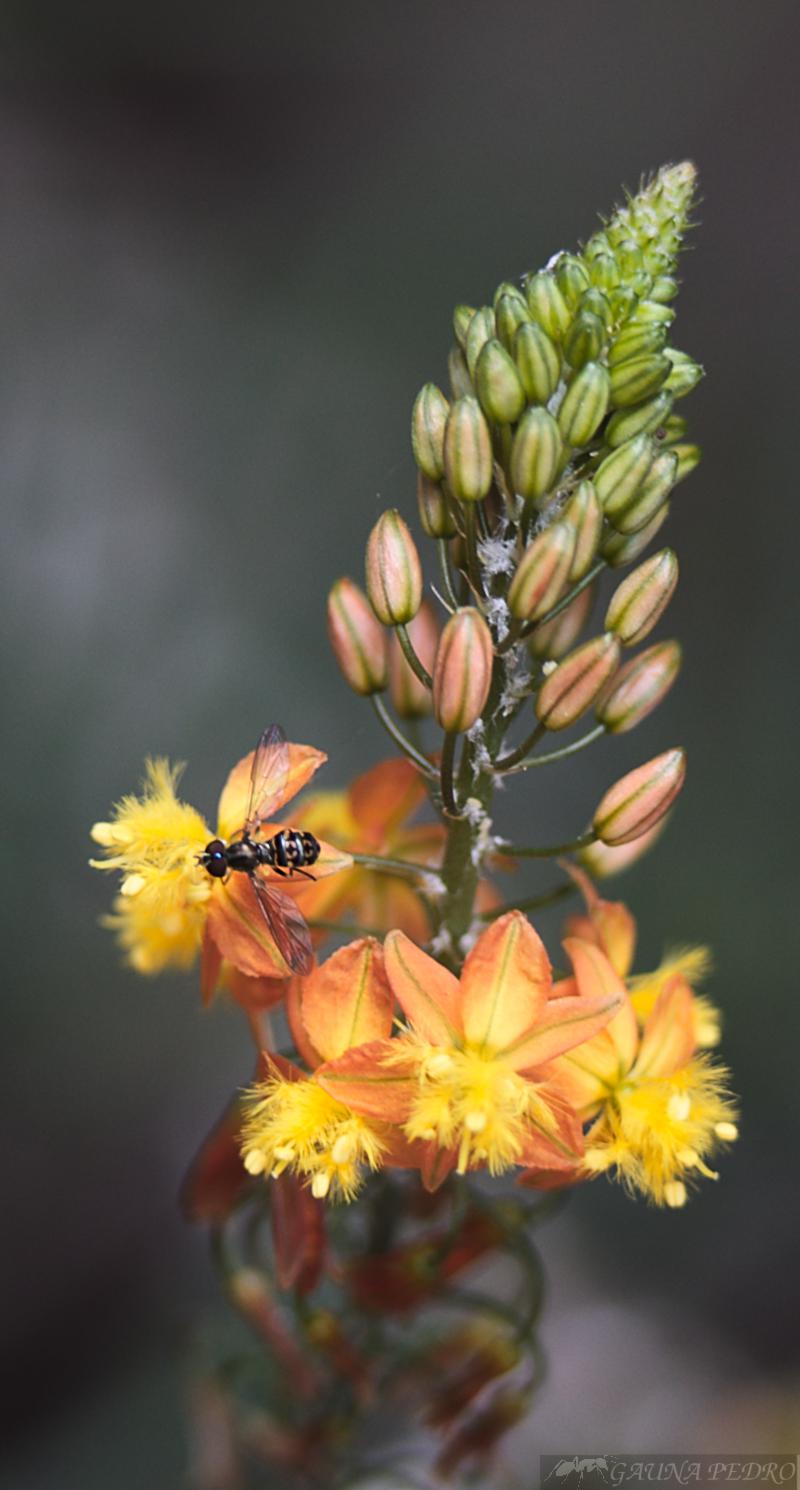Buenas (dedico esta foto a Marta Liber y Carmen Larzábal), sigo con el jardín, esta foto le tome a una flor cuyo nombre ignoro es mas la dueña de la misma ignora también su nombre (mide menos de 5 cm, y los tallos parecen los de una cebollita de verdeo) si las/los conocedores arrojan luz a su nombre (incluye la avispa) agradecido, se podría decir que realice la foto en situación controlada ya que me tome el tiempo de calibrar todo y después de varias tomas para lograr una buena, se aparece la avispa y descontrolo todo solo me dio tiempo de hacer dos tomas antes de que se marchara y esta es la que mejor quedo. Subo la imagen a flora ya que era la principal en mi toma, la avispa una figureti total. Use flash, tubo de extensión, sin trípode, pequeño recorte por la izquierda y mascara de enfoque. Salu2
