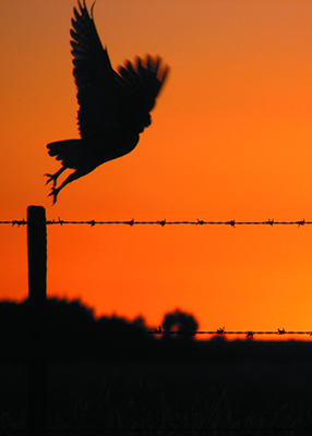 Fotografía de una lechuza en su primer aleteo en contraluz con el atardecer. Tomada en los campos de General San Martín, provincia de La Pampa Argentina. Luego de una larga espera del momento adecuado durante una cacería fotográfica una tarde de otoño.