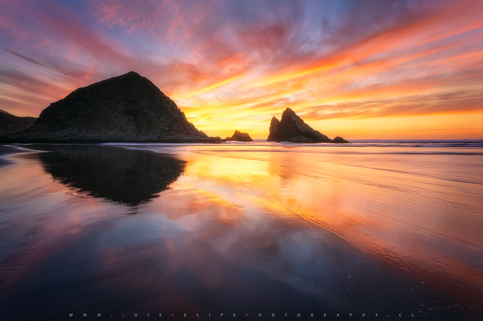 Durante el ultimo año he visitado este lugar varias veces, he podido ver como la luz del amanecer ilumina con una maravillosa sutileza este hermoso territorio; he caminado por la costa con neblina que a penas deja ver mas allá de un par de metros; he acampado bajo el bosque de pinos y he podido ver como el cielo nocturno se refleja en la laguna y espejos de agua que dejan las altas mareas; pero no había podido estar en un atardecer que mostrara la verdadera belleza que esconde este pequeño trozo de costa.