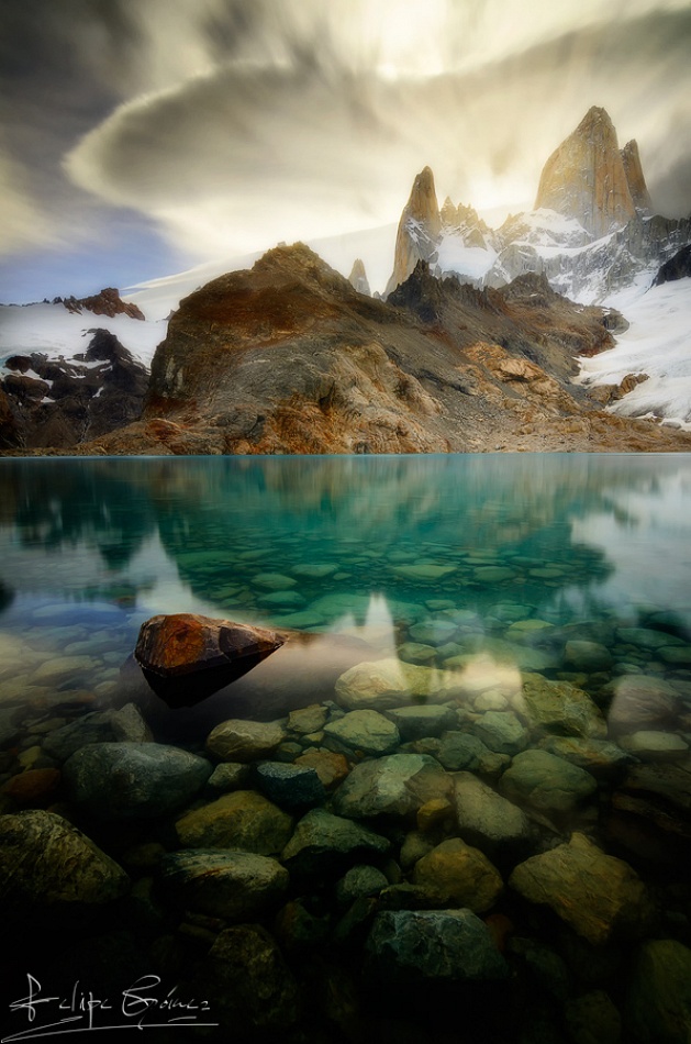 Hola Gerardo, gracias por comentar. La foto la saqué en la laguna a los pies de Fitz Roy. Tuve que meterme al agua hasta unos 10 metros adentro. El agua me hizo perder toda sensibilidad después de 5 minutos...un dolor tremendo al comienzo. De todas maneras valió el esfuerzo. Saludos.