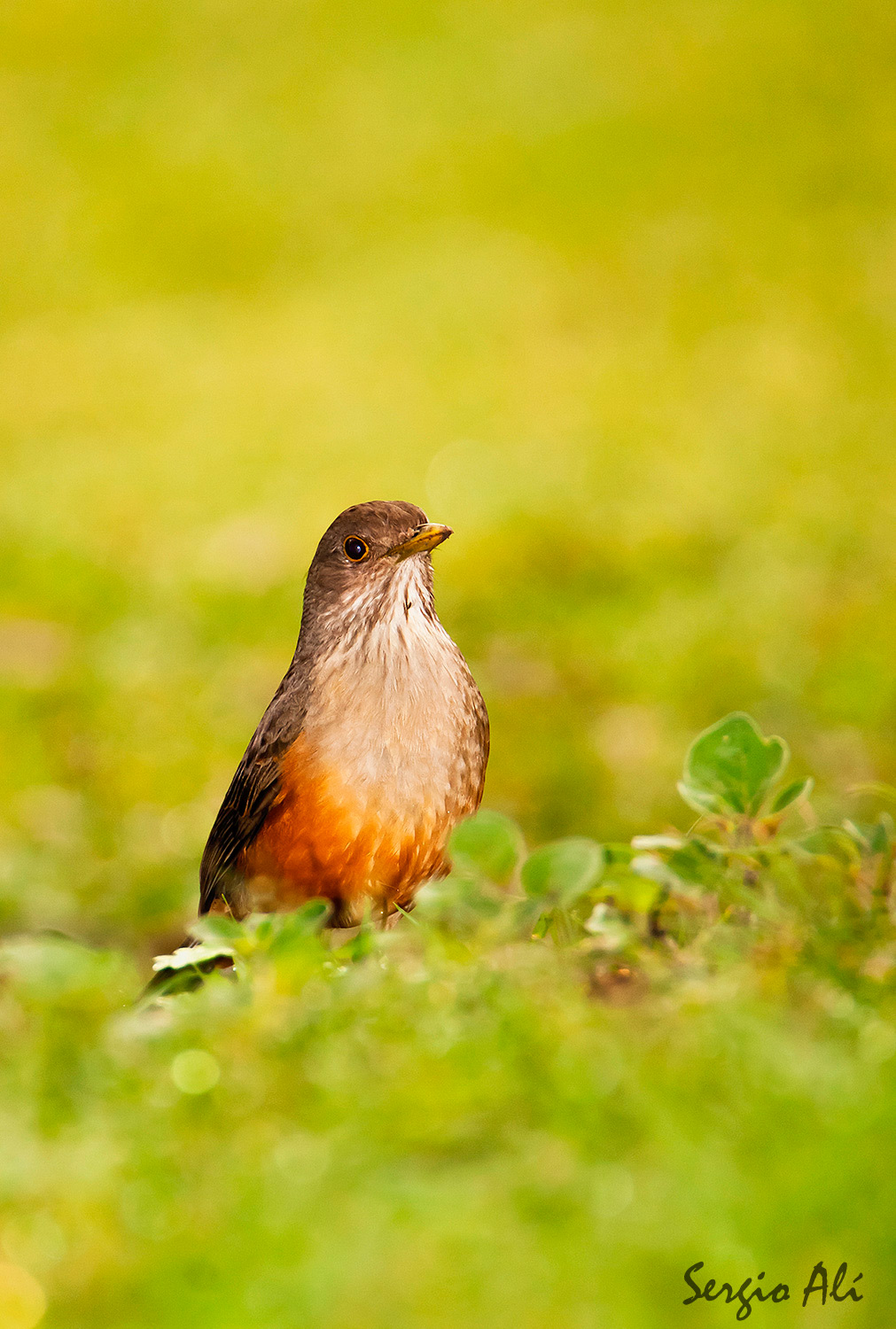 Hola, quería agradecer a todos los que pasaron por mis fotos anteriores. Este zorzal andaba a los saltitos por el pasto con rocío buscando alimento, aproveche una depresión en el terreno para sacarle a nivel del suelo. Tomada el año pasado en Reserva Natural Parque San Martín, La Picada. Edición básica, con flash.