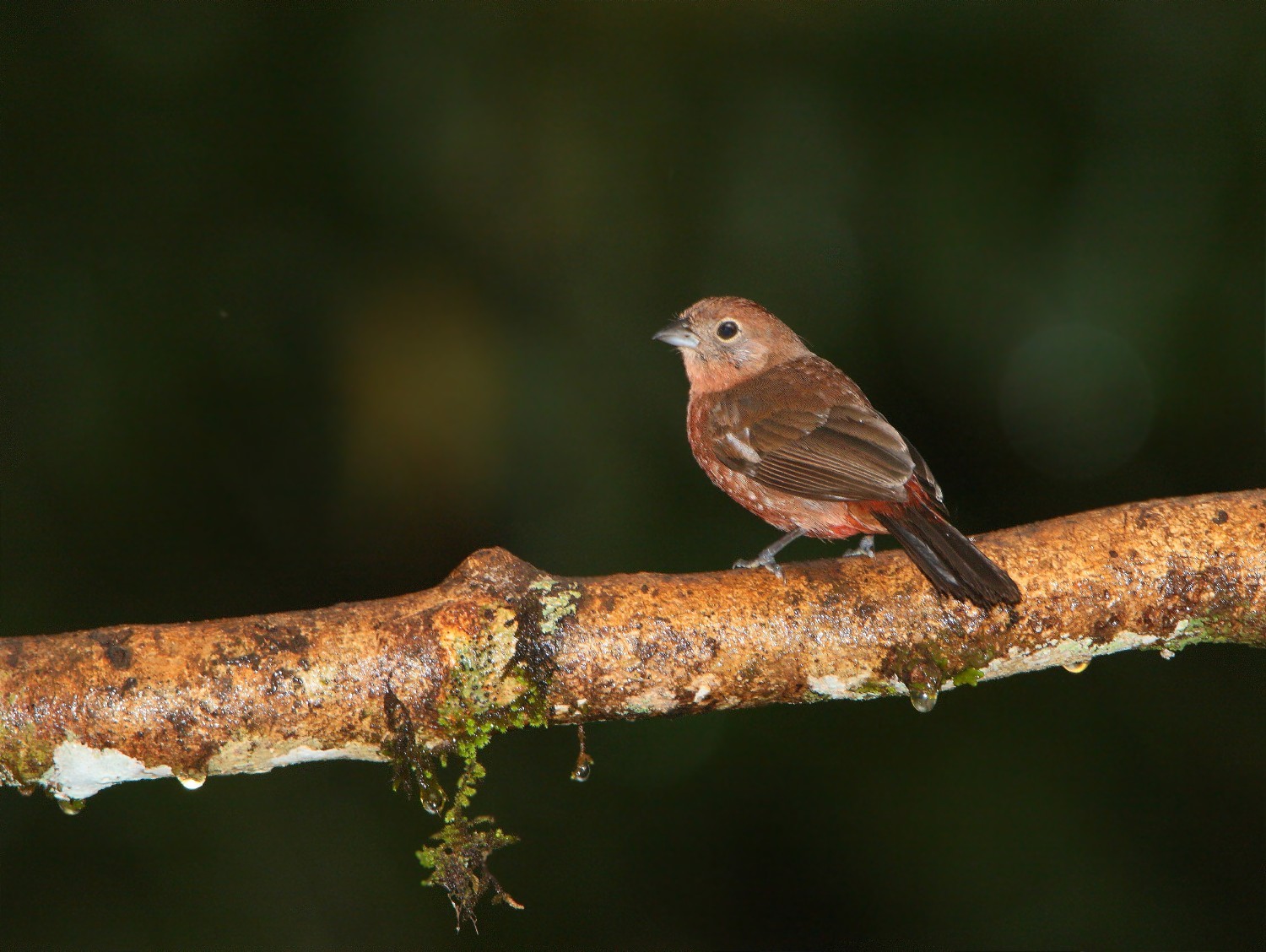La hembra tiene la cabeza, el dorso y las alas de color pardo. No posee copete. El ovispillo es rojizo, el vientre rosado oscuro y la cola negruzca.