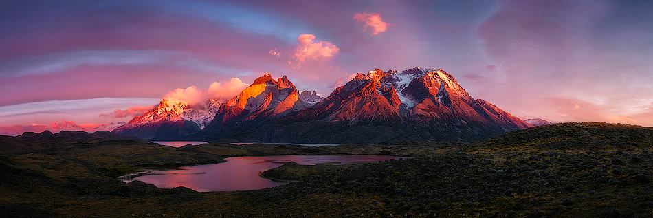 Este punto de vista es el resultado de la unión de 8 imágenes en una panorámica con el fin de lograr captar la inmensidad de este hermoso cordón de montañas de la Patagonia.