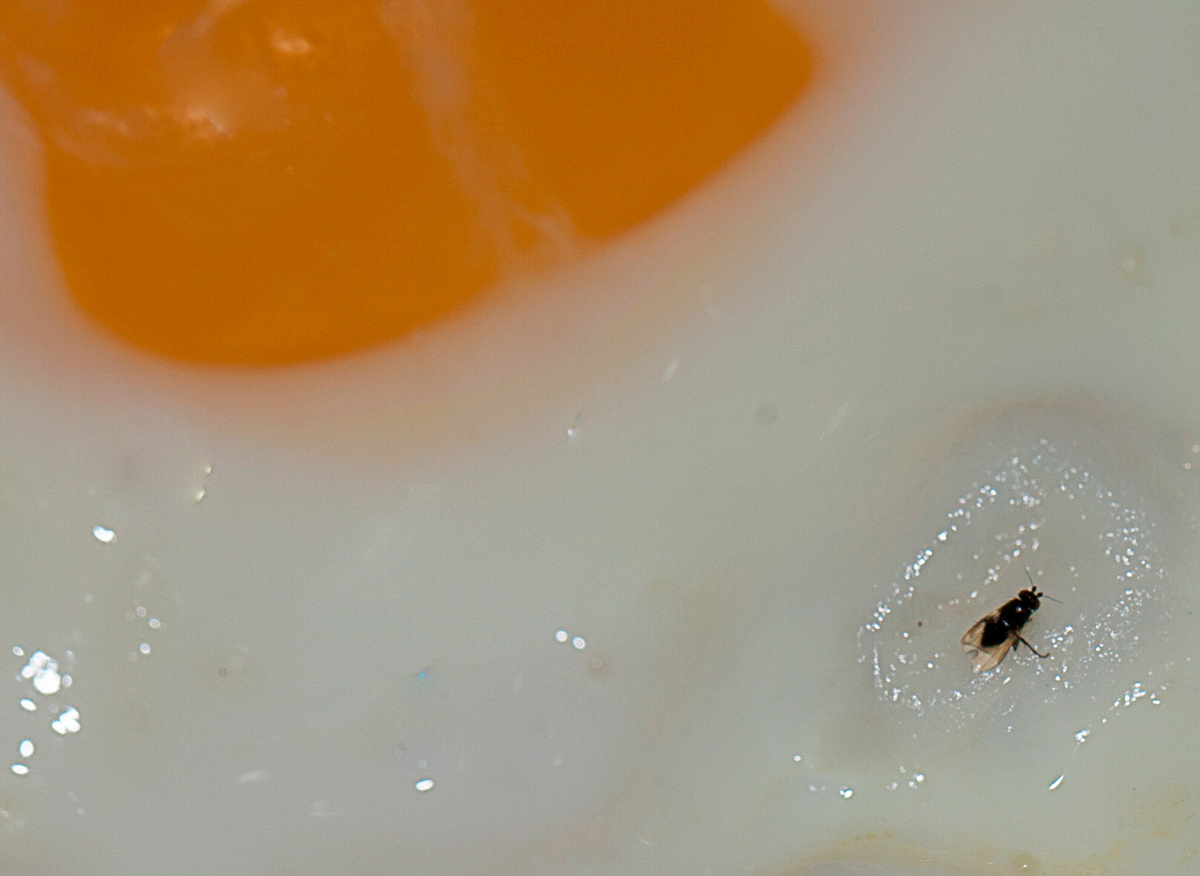 Estaba salando al huevo cuando veo que cayo algo negro. A simple vista no sabía que podía ser. Así que con el lente Canon macro 100mm le disparé. Ahi vi que era una minúscula mosca. Adosé el Raynox al lente pero no pude encontrarla, así que esta fue la única imagen que le saqué. Le hice un enorme recorte y así se ve más.