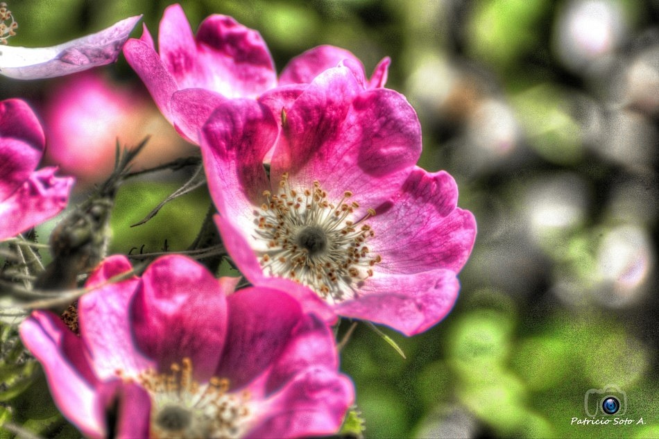Foto procesada con Photomatix Pro, Hdr, Flor de Rosa Mosqueta, La rosa mosqueta o simplemente mosqueta (Rosa eglanteria; sinónimo Rosa rubiginosa) es un arbusto silvestre de la familia de las rosáceas. Es una planta nativa de Europa, donde se cultiva sobre todo en el Reino Unido por su bella flor de color rosa pálido, pero que también se encuentra en estado silvestre en las estribaciones de la región sur de la Cordillera de los Andes, tanto en Chile como en Argentina, y en el piedemonte mendocino. Su fruto, conocido como escaramujo, se utiliza para la confección de dulces y mermeladas y para hacer infusiones. El aceite extraído de sus semillas se aprovecha en cosmética.