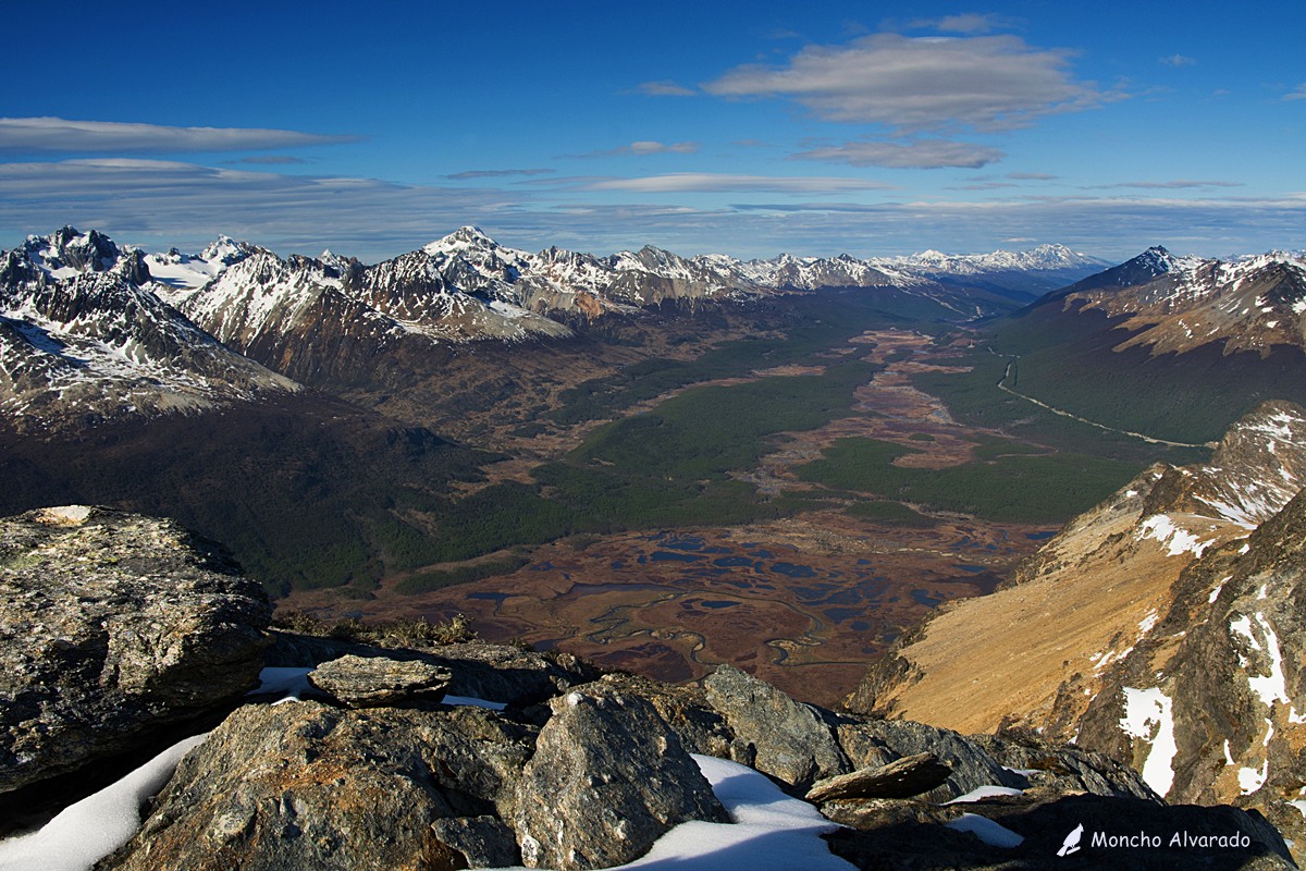 Saludos, esta imagen esta tomada desde el Cerro Portillo, aqui se puede apreciar parte del gran Valle Carbajal, a la izquierda la Cordillera de los Andes. El Valle es un turbal inmenso donde predomina el color rojizo que proviene de un musgo (Sphagnum magellanicum), estas turberas pueden alcanzar el metro y medio de alto, la superficie es esponjosa y blanda, caminar aqui resulta cansador y dificultoso, aunque creo mas cansador fue alcanzar el Cerro Portillo. Espero les guste.