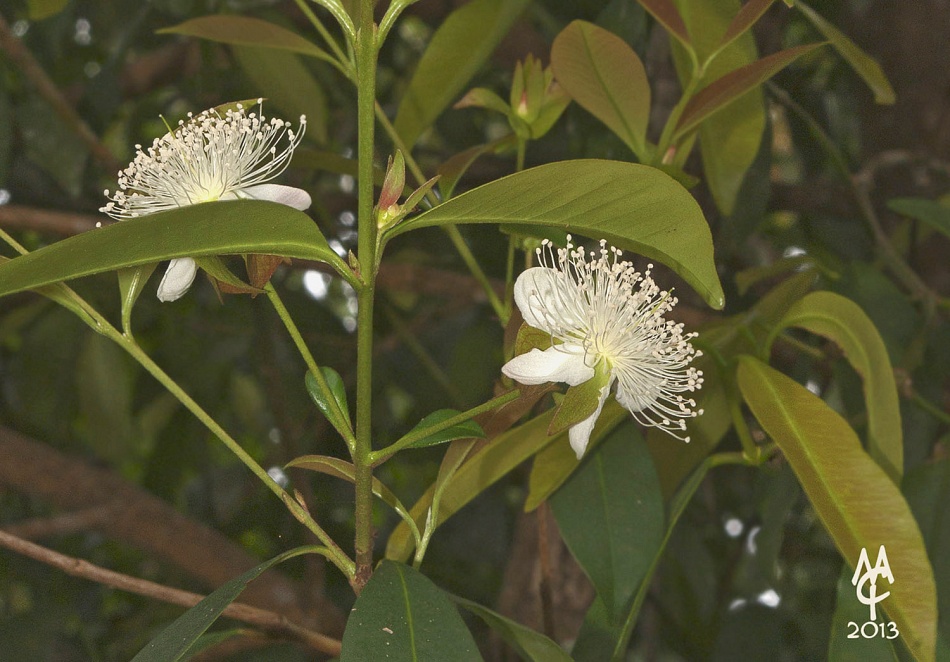 "Consultor Chaqueño", libro de texto utilizado en los establecimientos educativos del Chaco: "Ñangapirí TAICOC: Árbol pequeño, cuya altura no sobrepasa los 7 metros. Crece a orillas de los bosques. Su tronco es característicamente liso y con zonas rojizas. El follaje, de color verde oscuro, está constituido por hojas simples, con pecíolo corto, provistas de abundantes glándulas aromáticas. Las flores son muy numerosas y solitarias, poseen pétalos blancos, caedizos y su aparición coincide con la caída de las hojas, por lo que en este momento el árbol es sumamente ornamental. A las flores suceden los frutos, bayas globosas, ligeramente comprimidas, con surcos longitudinales que a medida que maduran viran del color rojo púrpura al negruzco. Son agradables para aves y también para el hombre, quien las consume crudas o preparadas en licores. Encierran una única semilla dura, de aproximadamente 8 mm de diámetro. Propiedades medicinales: Se le atribuyen distintas propiedades a las infusiones preparadas con sus hojas."