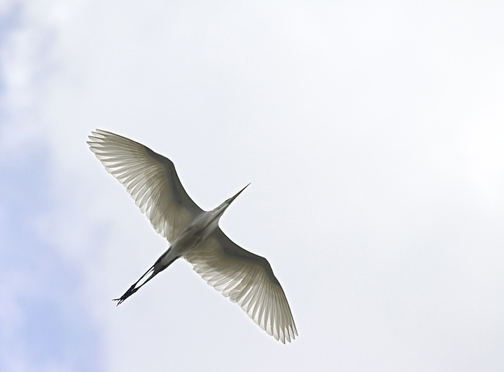 Pero hace mucho que quería tener una de estas en mi haber. Y no fué facil, pero la suerte estuvo de mi lado. Yendo por la ruta desde Galarza hacia Colonia Pellegrini, una tormenta en ciernes, un viento de aquellos, y una gigantesca bandada de garzas huyendo de la tormenta cruza la ruta. Fueron interminables minutos en los que garza tras garza volando sobre mi cabeza y yo click click click como diría el Lolo. Las garzas venían de donde estaba nublado y a mis espaldas todavía había retazos de cielo despejado. Se notaba que el viento les estaba complicando las cosas porque volaban muy bajo, nunca las había visto así, algunas pasaron tan cerca que tuve que cerrar el zoom para abarcarlas. Delante mío había una arboleda y ellas aparecían por detrás de ella, por lo que tuve que cruzar la ruta y aún así me tomaban por sorpresa, no sabía si iban a aparecer a la izquierda o a la derecha o exactamente sobre mi cabeza. Pero seguían y seguían así que tuve mi oportunidad. Puse prioridad velocidad y la dejé en 1/800 suficiente para congelar el vuelo lento de las garzas, la luz no favorecía y era distinta adelante que atrás por eso el automatismo. Y le pedí a la cámara que sobreexponga un punto. Suelo sobreexponer o subexponer pero los datos exif no lo graban y yo nunca me acuerdo lo que hice pero en este caso sí porque las garzas blancas contra las nubes blancas son fáciles, siempre hay que sobreexponer porque sinó sale todo gris. Cuando tenemos vegetación de fondo no solo no hay que sobreexponer sino que incluso hay que subexponer un poco so pena de quemar esas plumas tan bellas. Bueno estoy re contenta con esta, la saqué cuando ya había pasado sobre mi cabeza así que yo estaba en una posición medio ridícula, con la cabeza hacia atrás y la espalda toda arqueada, fué la última de la ráfaga. Y una de las últimas que fotografié, porque la tormenta ya se nos venía encima :-). Espero les guste.