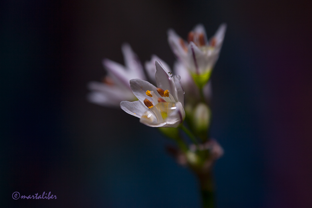 MUY LINDA FOTO, COMO RESALTAN LAS FLORES SOBRE EL FONDO OSCURO, AH Y ADEMAS EL DETALLE DE LAS GOTAS EXCELENTE, FELICITACIONES Y SALUDOS.