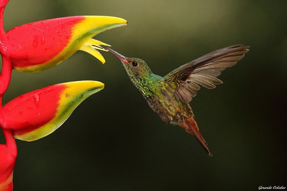Flor y Picaflor contrastando colores y a cual mas lindo. Muy buena